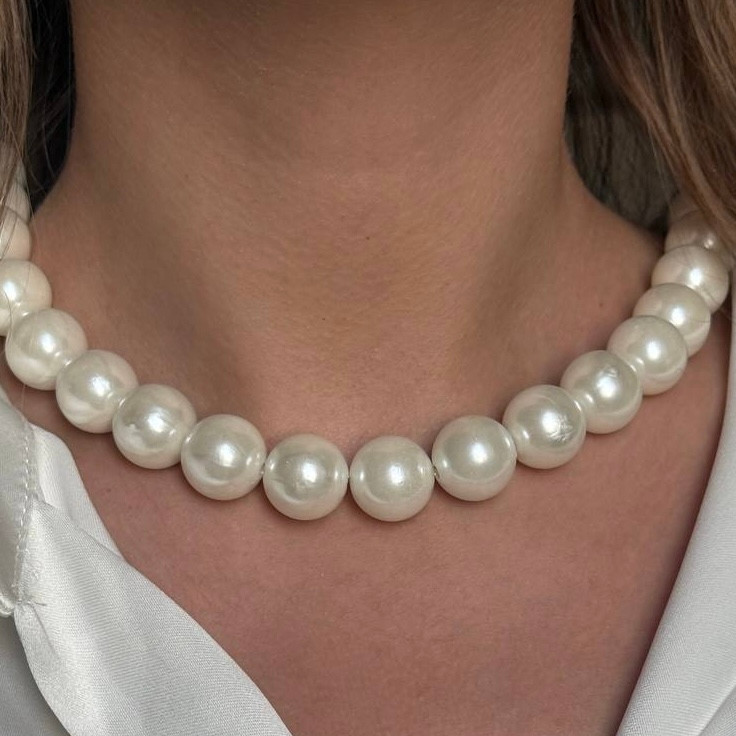 این گردنبند با مهرههای مرواریدی بزرگ و یکدست، جلوهای کلاسیک، شیک و زنانه به استایل شما میبخشه. مرواریدهای مصنوعی با سطح براق و فرم گرد، حس لطافت و وقار رو منتقل میکنن و در کنار زنجیر نقرهای، ترکیبی از زیبایی و دوام رو ارائه میدن.