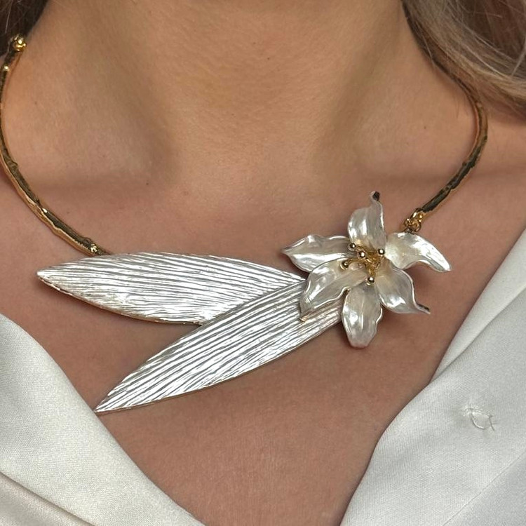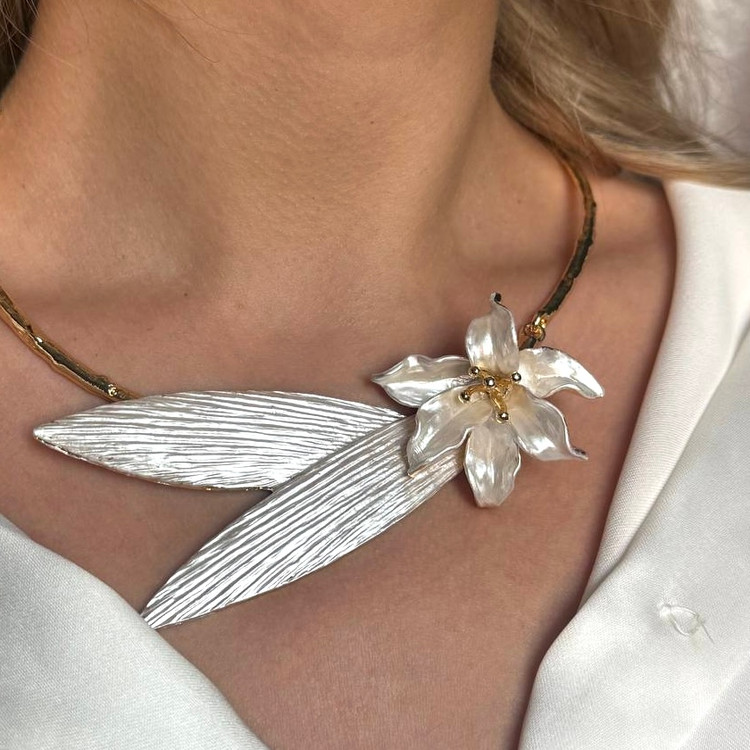 این گردنبند خاص با طراحی توق (گردنبند حلقهای) و آویز گل و برگ، جلوهای هنری و طبیعتگرا به استایل شما میبخشه. گل با گلبرگهای نیمهشفاف و مرکز طلایی، در کنار برگهای نقرهای با بافت خطدار، ترکیبی از ظرافت، اصالت و خلاقیته. زنجیر طلایی با بافت شاخهای، حس طبیعی و دستساز بودن رو تقویت میکنه.