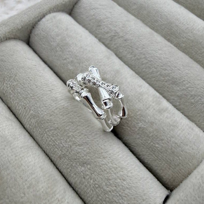 انگشتر نقرهای با طراحی اسکلتمانند و نگینهای ظریف – جسارت درخشان در فرم آناتومیک