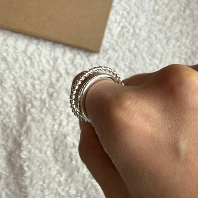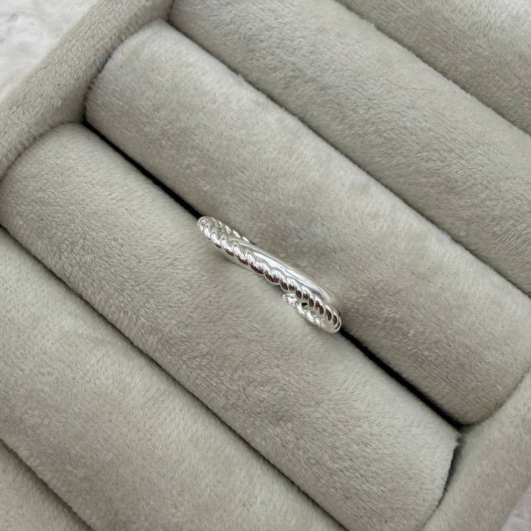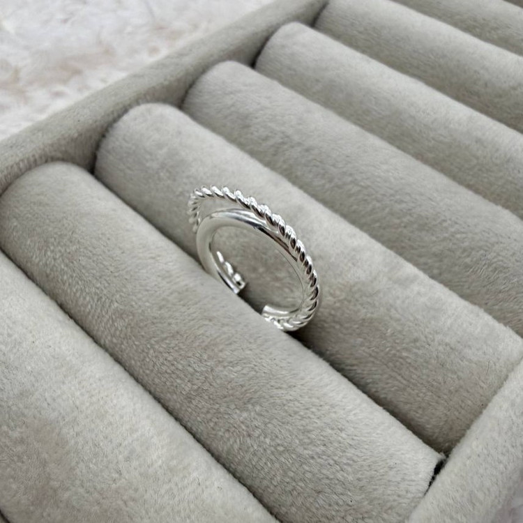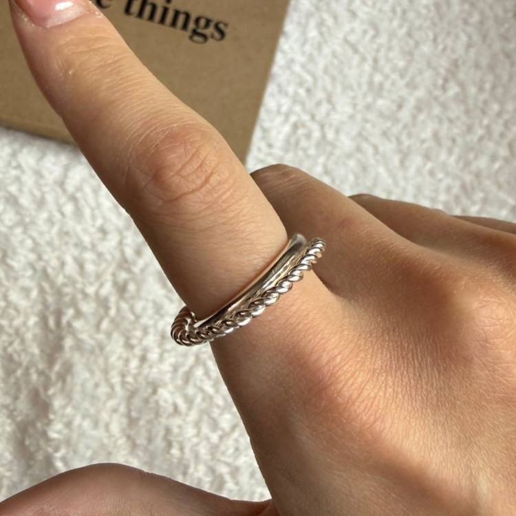 این انگشتر با طراحی دوتایی و متصل، ترکیبی از دو فرم متفاوت در یک قطعه ارائه میدهد: یک بخش با سطح صاف و صیقلی، و بخش دیگر با فرم پیچخورده یا طنابی. این تضاد بافت، جلوهای مدرن، مینیمال و خاص ایجاد میکند—برای کسانی که به دنبال جزئیات ظریف در طراحی هستند.