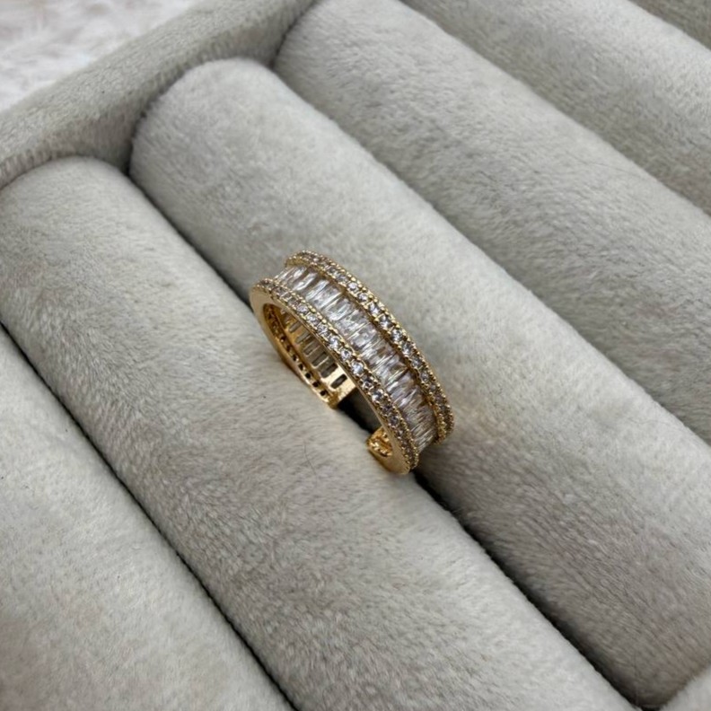- انگشتر طلایی با نگینهای درخشان، جلوهای گرم و مجلل دارد