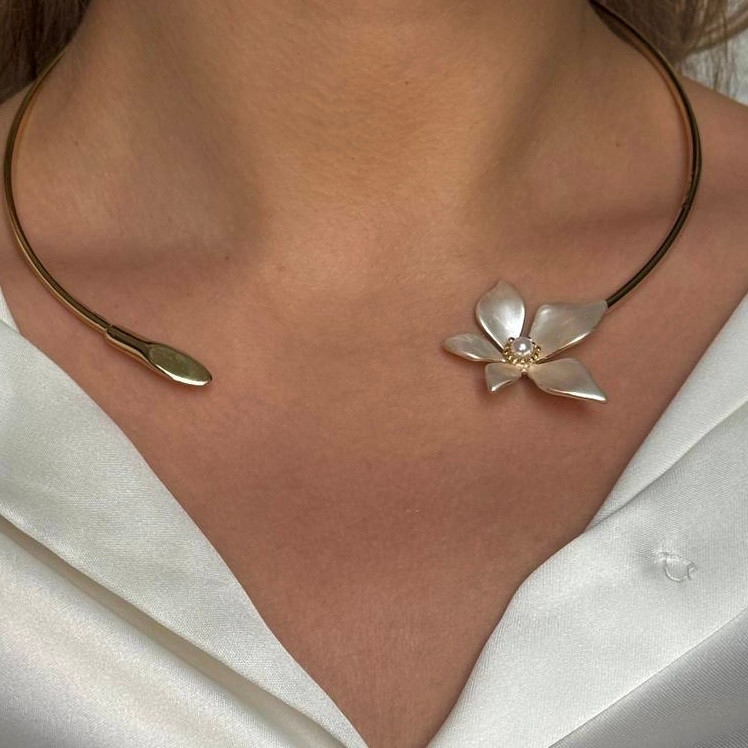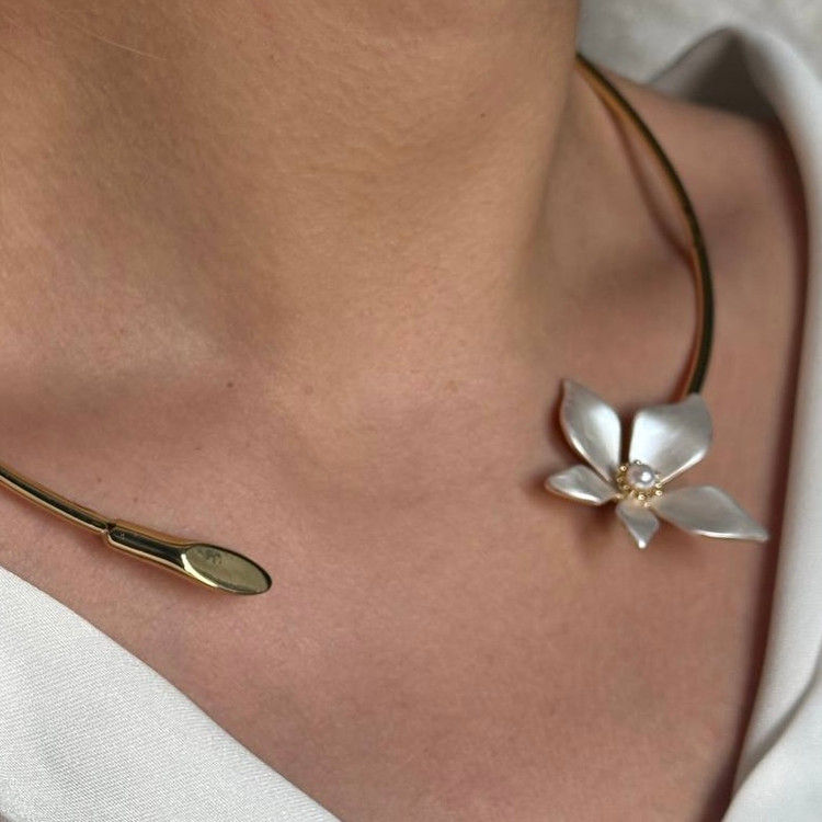گردنبند توق با طراحی شاخهای طلایی و آویز گل میناکاری، جلوهای خاص و طبیعتگرا به استایل شما میبخشه. گل با گلبرگهای سفید رزینی و مرکز طلایی، نمادی از لطافت و اصالت زنانه است. این گردنبند بهتنهایی چشمنوازه، اما در کنار گوشواره و بنگل ست، جلوهای کامل و فاخر پیدا میکنه.