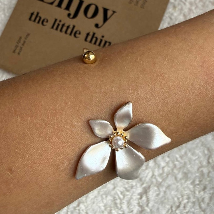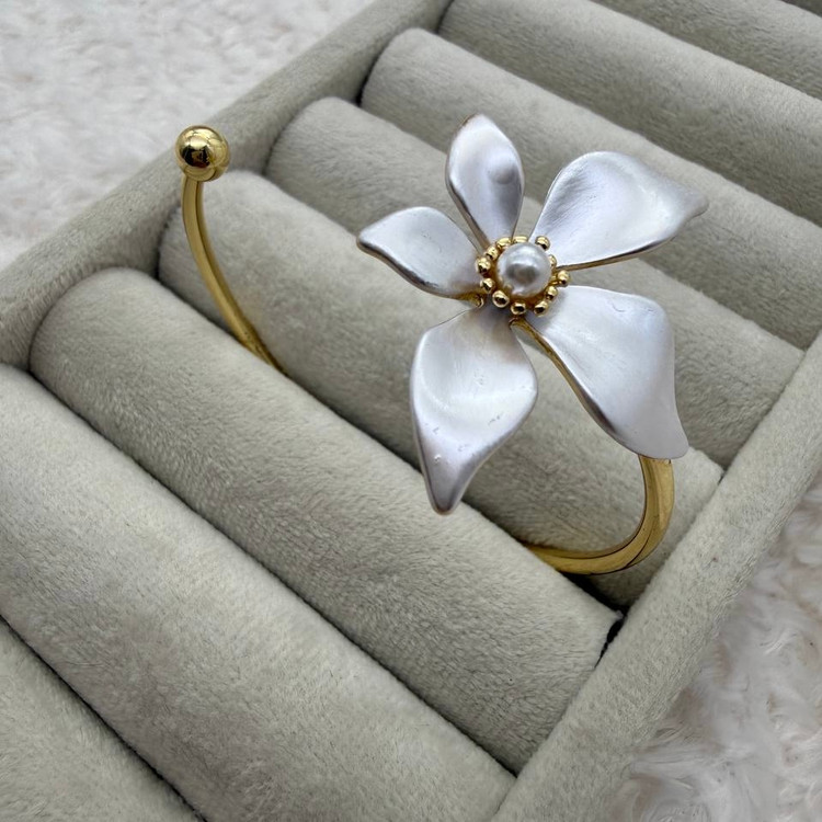 این بنگل با طراحی گل برجسته و رزینی، ترکیبی از هنر دستساز و ظرافت مدرن است. گل مرکزی با گلبرگهای سفید و مروارید وسط، روی زمینهی طلایی قرار گرفته و جلوهای خاص به مچ دست شما میده. در کنار گردنبند و گوشواره ست، استایل شما کامل و هماهنگ خواهد بود.