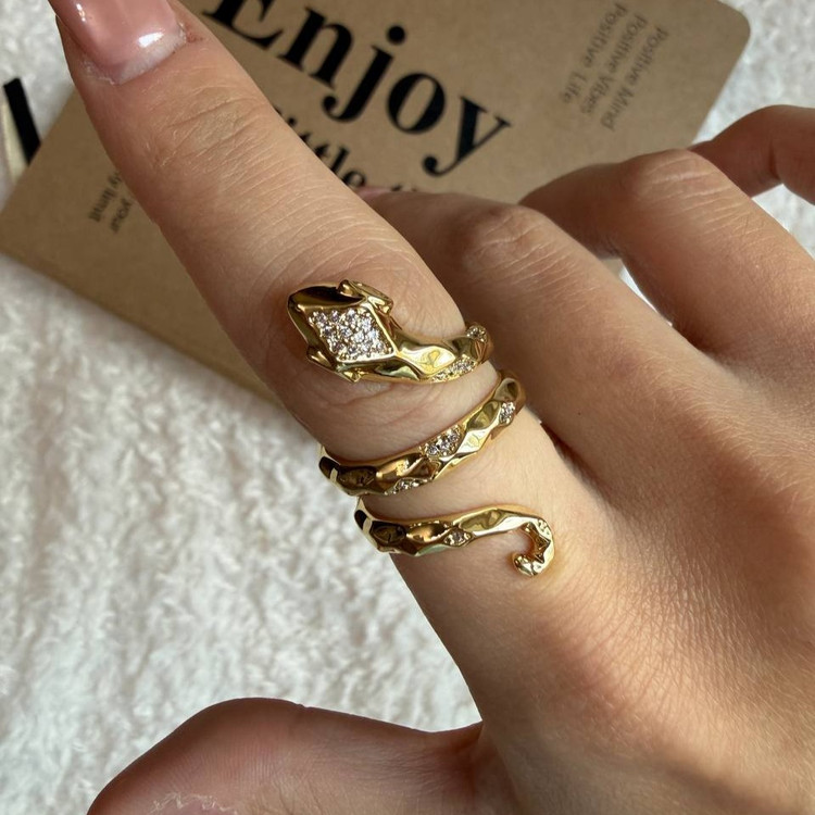 انگشتر مار طلایی با نگینهای درخشان – نماد قدرت، پیچیدگی و زیبایی