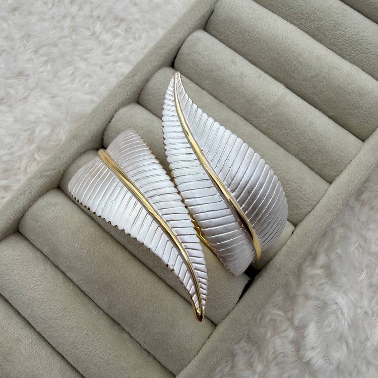 این دستبند با طراحی دو برگ متقارن که بهنرمی دور مچ میپیچند، جلوهای لطیف، هنری و خاص دارد. بافت رگهدار برگها و خط طلایی مرکزی، ترکیبی از جزئیات طبیعی و ظرافت فلزی ایجاد میکند—مناسب برای استایلهای رمانتیک، هنری یا مینیمال.