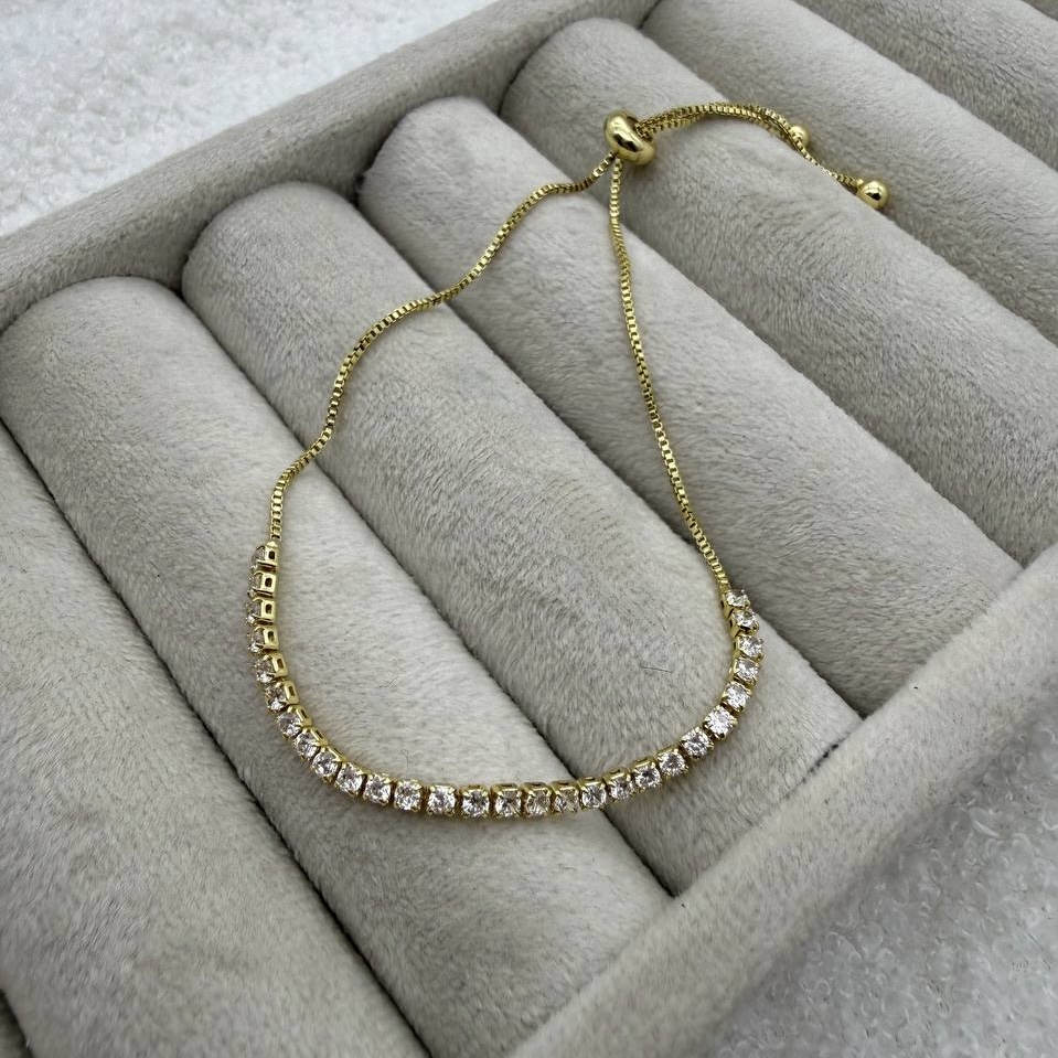 این دستبند با طراحی کلاسیک و ردیف نگینهای اتمی شفاف، جلوهای لوکس و چشمنواز به دستان شما میبخشه. قابهای ظریف نگیندار روی زمینهی طلایی با آبکاری رادیوم، درخششی ماندگار و ضد حساسیت ایجاد میکنن. قفل کراواتی قابل تنظیم، راحتی استفاده و فیت دقیق روی مچ رو تضمین میکنه.