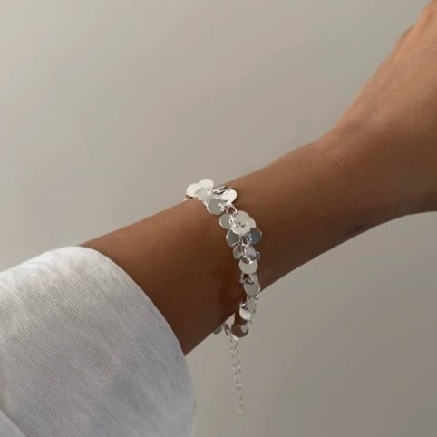 این دستبند زیبا با طراحی مینیمال و دیسکهای فلزی براق، انتخابی بینظیر برای کسانی است که به دنبال ترکیبی از ظرافت و درخشش هستند.
