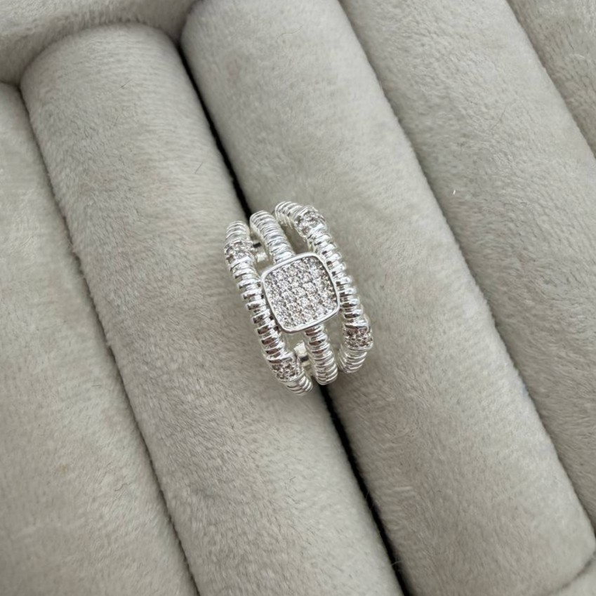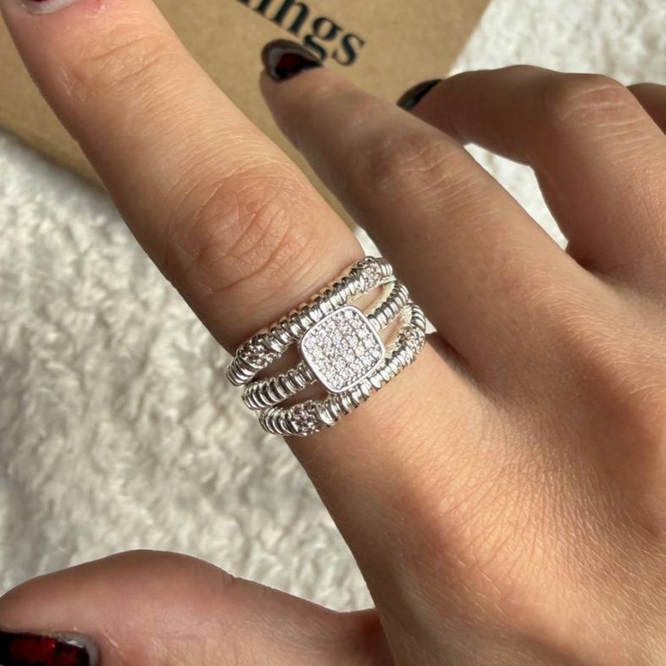 - انگشتر نقرهای با فرم مربعی نگیندار و بند شیاردار، حس مدرن و خنثی رو منتقل میکنه
