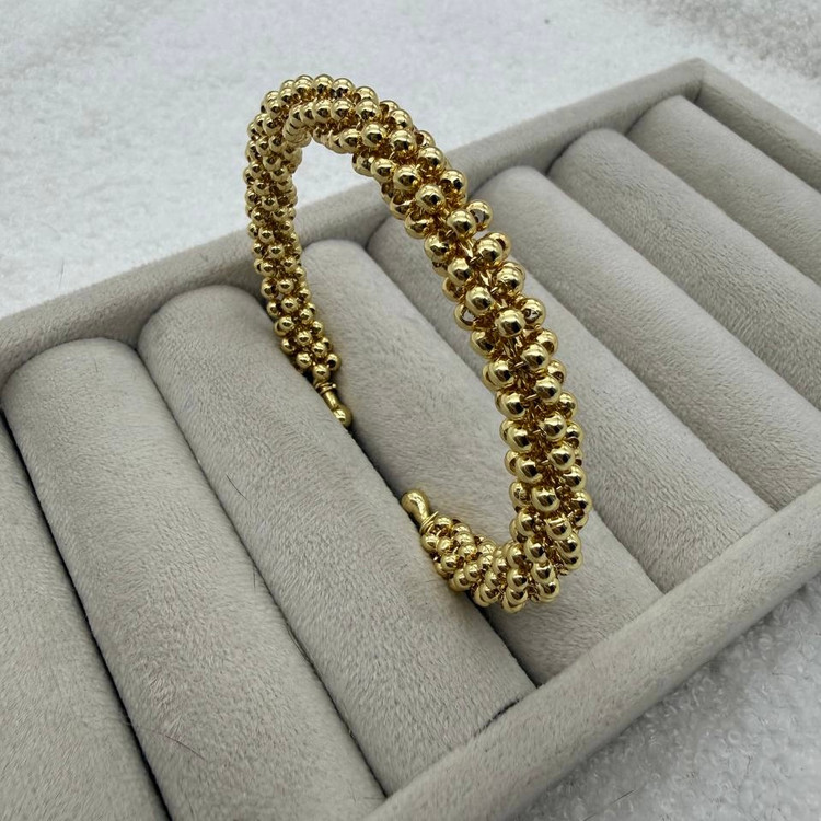 این بنگل با طراحی خاص و بافت دانهدانهی طلایی، جلوهای لوکس، زنانه و چشمنواز داره. مهرههای کروی کوچک با چینش منظم، حس خاویاری و ظرافت سلطنتی رو منتقل میکنن. رنگ طلایی گرم و پرداخت براق، این مدل رو به انتخابی عالی برای مهمانیها یا استایلهای خاص تبدیل کرده.