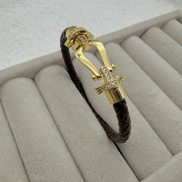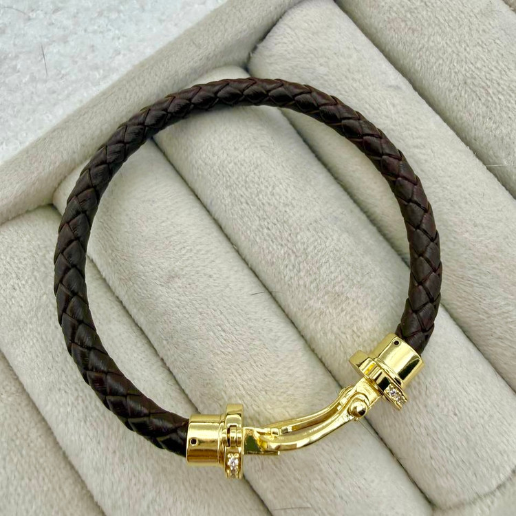 این دستبند با بند چرمی بافتدار قهوهای و قفل طلایی با طراحی خاص، ترکیبی از اصالت، استحکام و ظرافت مردانهست. قفل فلزی با جزئیات مکانیکی و نگینهای ظریف، جلوهای لوکس و خاص به این مدل داده. مناسب برای استایلهای رسمی، اسپرت یا کژوال با رنگهای گرم و طبیعی.