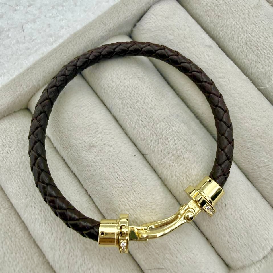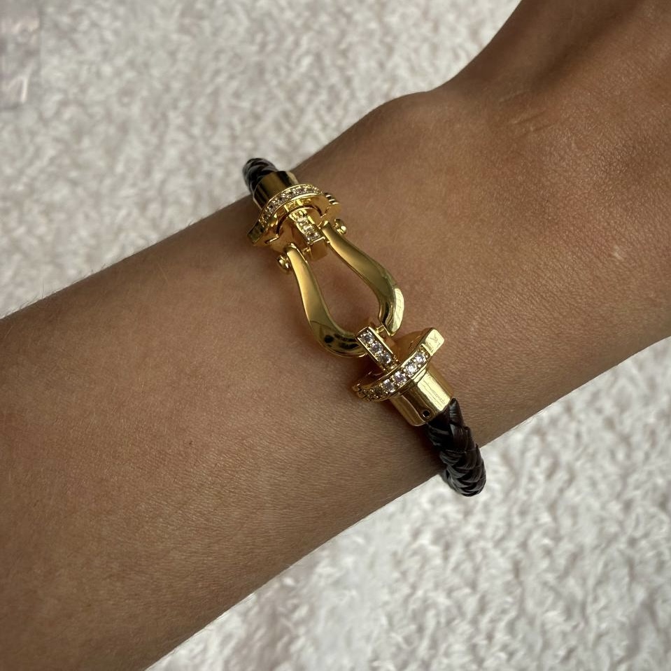 این دستبند با بند چرمی بافتدار قهوهای و قفل طلایی با طراحی خاص، ترکیبی از اصالت، استحکام و ظرافت مردانهست. قفل فلزی با جزئیات مکانیکی و نگینهای ظریف، جلوهای لوکس و خاص به این مدل داده. مناسب برای استایلهای رسمی، اسپرت یا کژوال با رنگهای گرم و طبیعی.