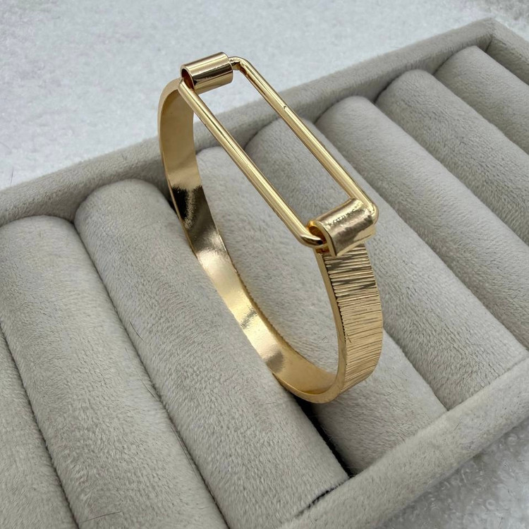 این بنگل با طراحی هندسی و فرم مستطیلی، ترکیبی از سادگی و جسارته. سطح بافتدار در کنار بخشهای صیقلی، جلوهای مدرن و خاص به این مدل داده. عرضهشده در دو رنگ طلایی و نقرهای، با آبکاری باکیفیت و رنگ ثابت، مناسب برای استایلهای مینیمال، رسمی یا روزمرهی خاصه.