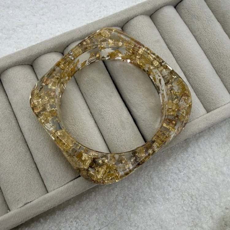 این بنگل با طراحی خاص و فرم مربعی با لبههای گرد، ترکیبی از هنر مدرن و ظرافت کلاسیکه. رزین شفاف با زرورقهای طلایی شناور، جلوهای لوکس، سبک و چشمنواز به مچ شما میده. مناسب برای استایلهای مینیمال، هنری یا مجلسی با رنگهای خنثی یا گرم.