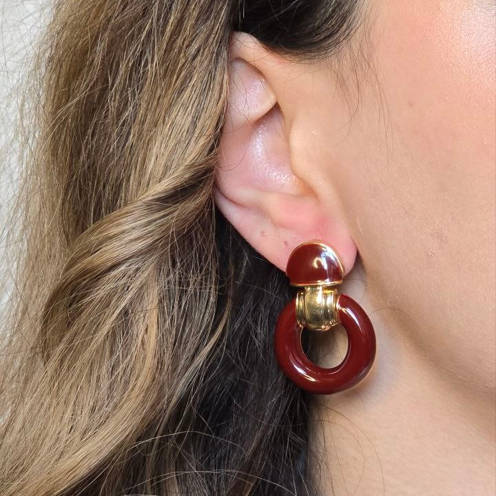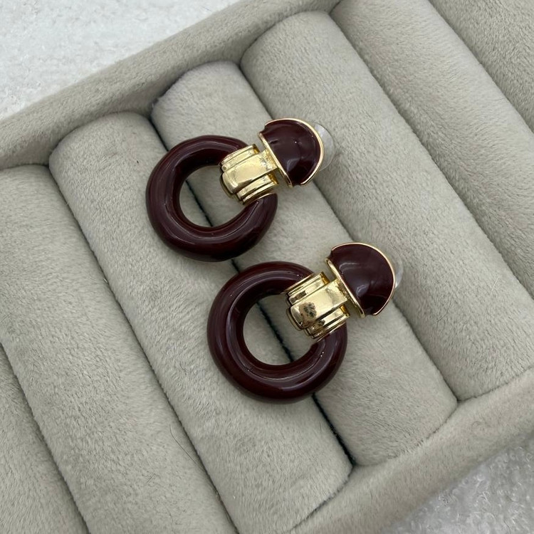 این گوشوارهها با طراحی دایرهای و رنگ زرشکی عمیق، جلوهای خاص و هنری دارن. ترکیب رزین براق با قاب فلزی طلایی، حس کلاسیک و مدرن رو همزمان منتقل میکنه. مناسب برای استایلهای پاییزی، رسمی یا خاصپسند.