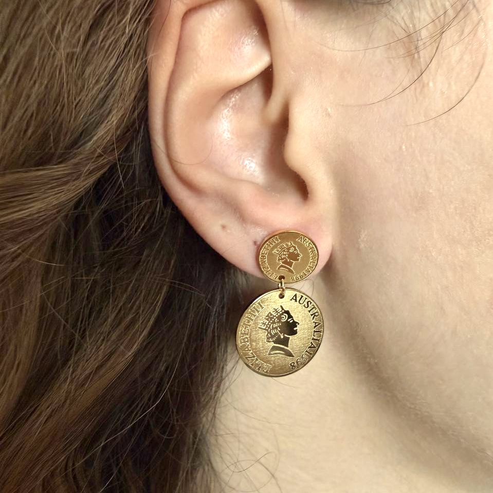 این گوشوارهها با طراحی سکهای و نقش برجستهی ملکه الیزابت، ترکیبی از اصالت تاریخی و جلوهای فشن دارن. رنگ طلایی براق در کنار فرم کلاسیک سکه، حس سلطنتی و خاصپسند رو منتقل میکنه. پشتمیخی بودنش باعث راحتی در استفاده روزانه شده.