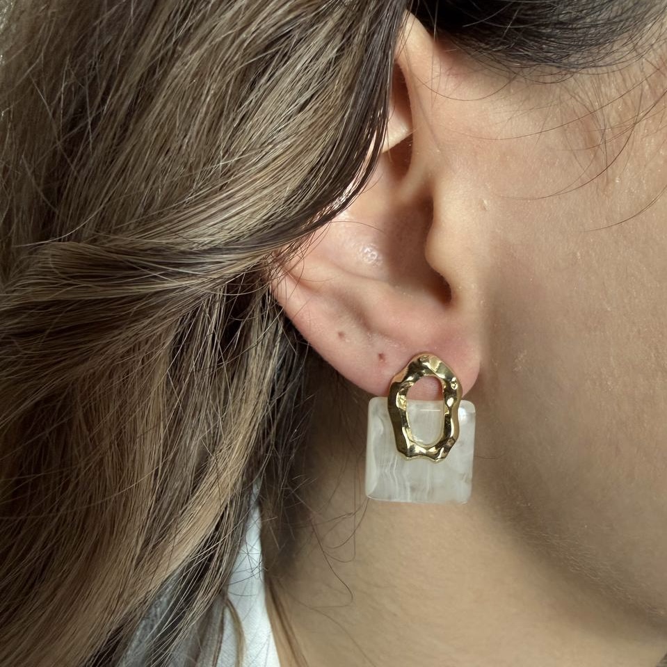 این گوشوارهها با طراحی خاص و ترکیب بافت مرمری و فلز طلایی، جلوهای هنری و مدرن دارن. فرم نامنظم طلایی روی پایهی مستطیلی شفاف، حس دستساز و خاصپسند رو منتقل میکنه. پشتمیخی بودنش باعث راحتی در استفاده روزانه شده و طراحی متفاوت اون، مناسب استایلهای مینیمال و فشنه.