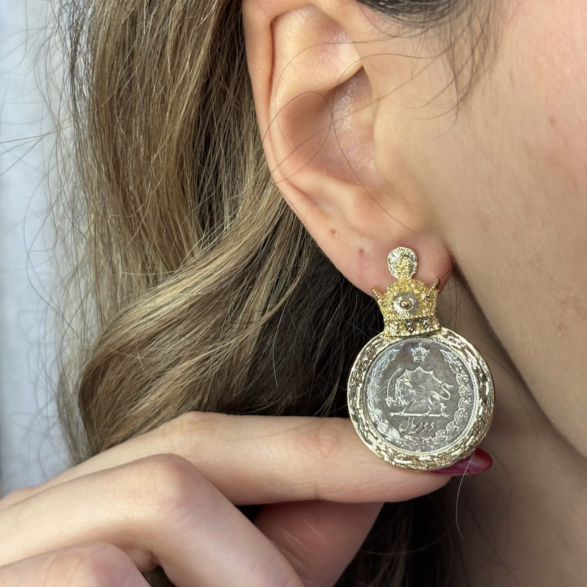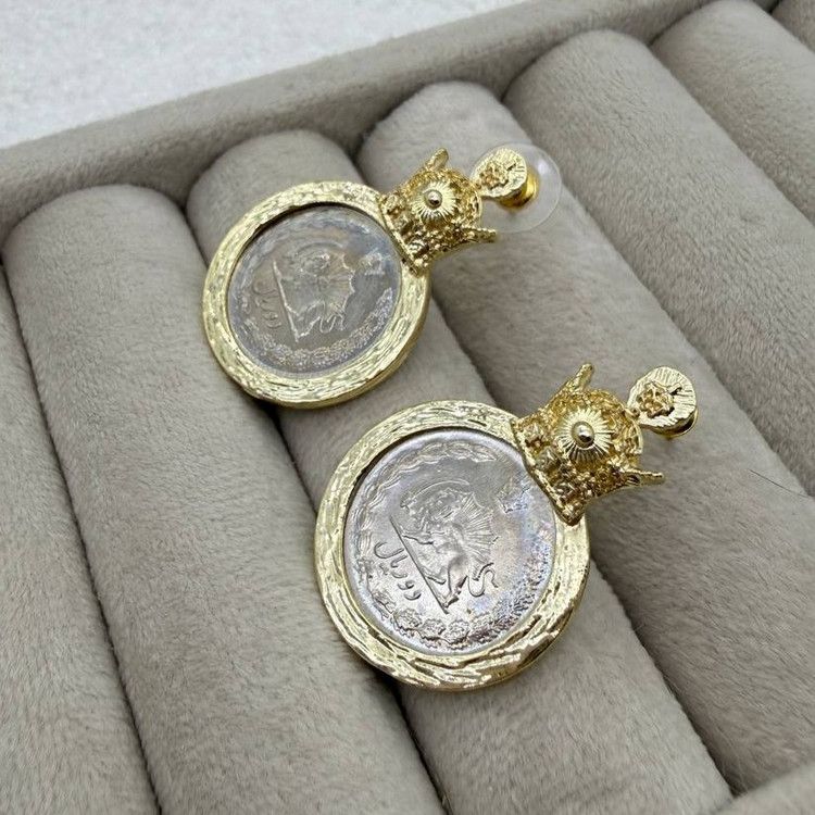 این گوشوارهها با فرم سکهای و قاب طلایی با تاج برجسته، انتخابی عالی برای استایلهای کلاسیک، مجلسی یا فرهنگی هستن. طراحیشون الهامگرفته از نمادهای سلطنتی و تاریخیست، و ترکیب نقره و طلا، جلوهای متعادل و لوکس ایجاد کرده.