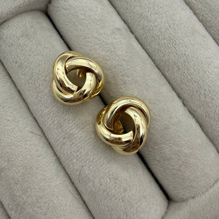 این گوشوارهها با طراحی گرهدار و سطح طلایی صیقلی، جلوهای کلاسیک و در عین حال مدرن دارن. فرم پیچخوردهی فلز حس حرکت و انرژی رو منتقل میکنه، در حالی که قفل پشتمیخی استفادهی روزانه رو راحت و ایمن کرده.