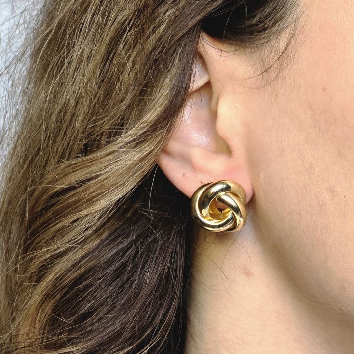 این گوشوارهها با طراحی گرهدار و سطح طلایی صیقلی، جلوهای کلاسیک و در عین حال مدرن دارن. فرم پیچخوردهی فلز حس حرکت و انرژی رو منتقل میکنه، در حالی که قفل پشتمیخی استفادهی روزانه رو راحت و ایمن کرده.