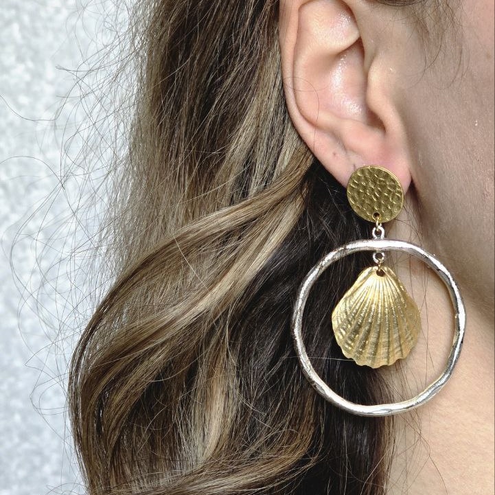 گوشواره ساحلی با حلقه نقرهای، دیسک چکشی و آویز صدفی – تابستان در فرم، درخشش در جزئیات