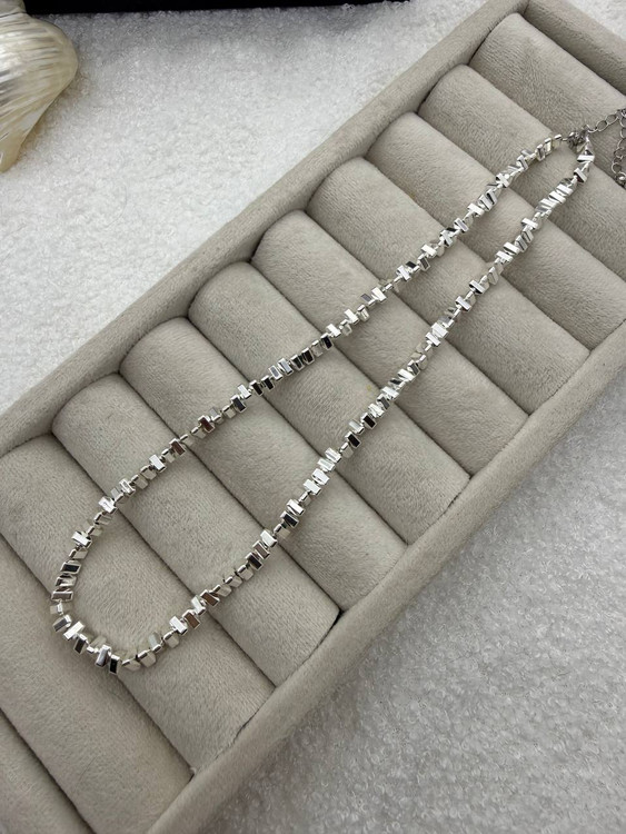 این گردنبند با طراحی پیانویی و چیدمان منظم قطعات مستطیلی، ترکیبی از نظم موسیقایی و درخشش مینیمال داره. آبکاری نقرهای براق، جلوهای خنک و مدرن به استایل شما میده. فرم چسبان اون، مناسب برای استایلهای یقهدار یا لباسهای بازه.