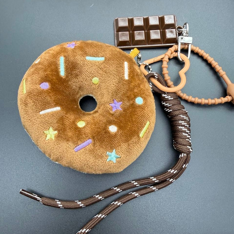 این آویز فانتزی با طراحی دونات پشمالو و تخته شکلات رزینی، حس لطافت، شادی و نوستالژی رو به کیف شما اضافه میکنه. جزئیات رنگی روی دونات و بافت برجستهی شکلات، استایل کیف رو خاص و شخصیسازیشده نشون میده.