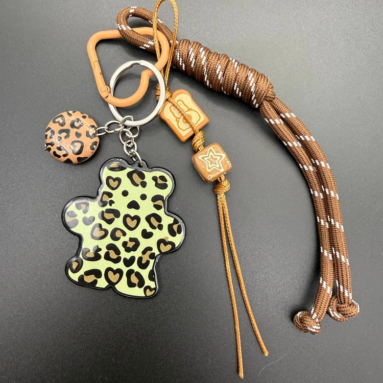 این آویز خاص با عروسک رزینی طرح خرس پلنگی، مهرههای رنگی و بندهای بافتدار، جلوهای فانتزی و پرانرژی به کیف شما میده. ترکیب رنگهای گرم و جزئیات گرافیکی، استایل کیف رو شخصیسازیشده و متفاوت نشون میده.