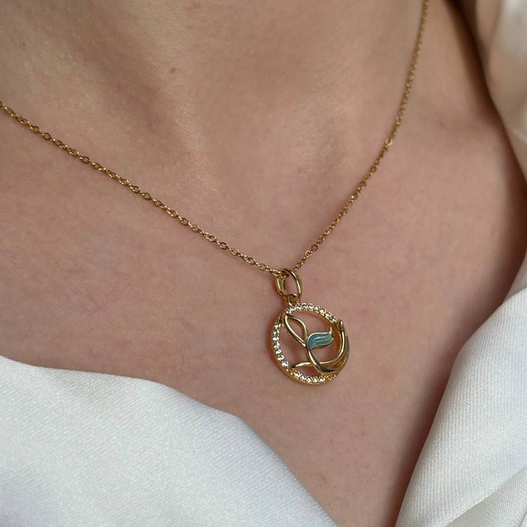 این گردنبند با طراحی متقارن و جزئیات هنری، انتخابی عالی برای استایلهای روزمره، مینیمال یا خاصه. ترکیب نگینهای شفاف با دم واله طلایی و نقطهی فیروزهای، حس طبیعت، حرکت و لطافت رو منتقل میکنه.