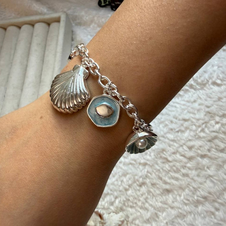 این دستبند زیبا با طراحی چارمدار الهامگرفته از عناصر دریایی، انتخابی شیک و متفاوت برای استایلهای خاص و تابستانی است. ترکیب چارمهای صدف، ستاره دریایی، مروارید و جزئیات مینیمال، جلوهای لطیف و چشمنواز به این دستبند بخشیده است.
