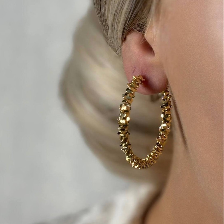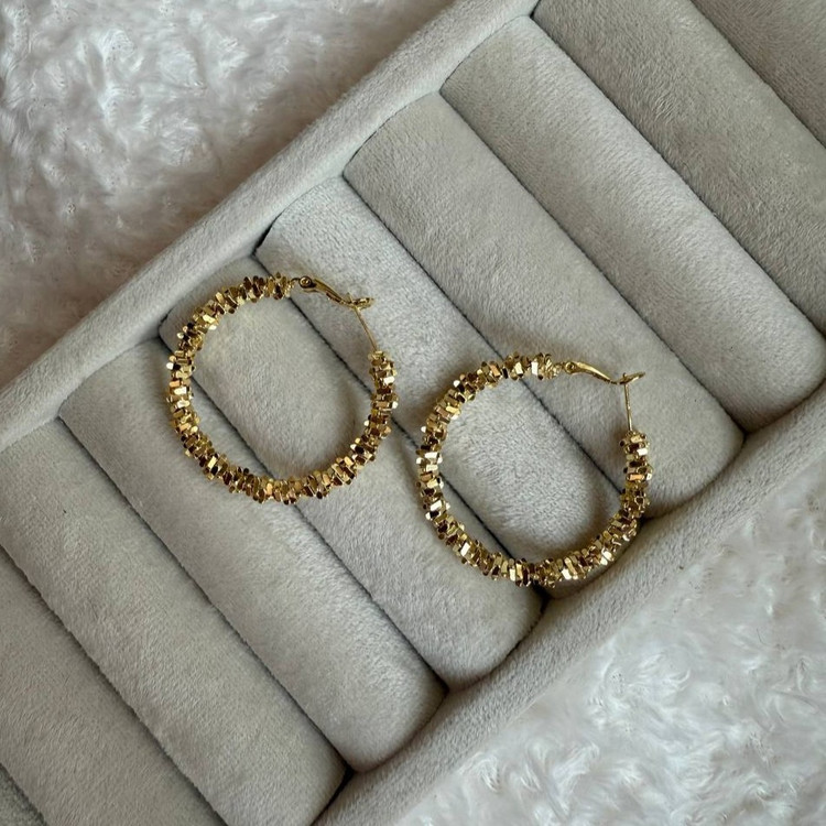این گوشوارهی حلقهای با طراحی بافتدار و جزئیات برجسته، یادآور بافت خاویار طلاییست؛ ترکیبی از ظرافت کلاسیک و جلوهی مدرن. انعکاس نور روی سطح برجستهی طلا، جلوهای چشمگیر و لوکس به استایل شما میبخشه.