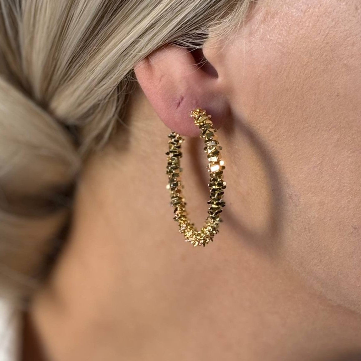این گوشوارهی حلقهای با طراحی بافتدار و جزئیات برجسته، یادآور بافت خاویار طلاییست؛ ترکیبی از ظرافت کلاسیک و جلوهی مدرن. انعکاس نور روی سطح برجستهی طلا، جلوهای چشمگیر و لوکس به استایل شما میبخشه.