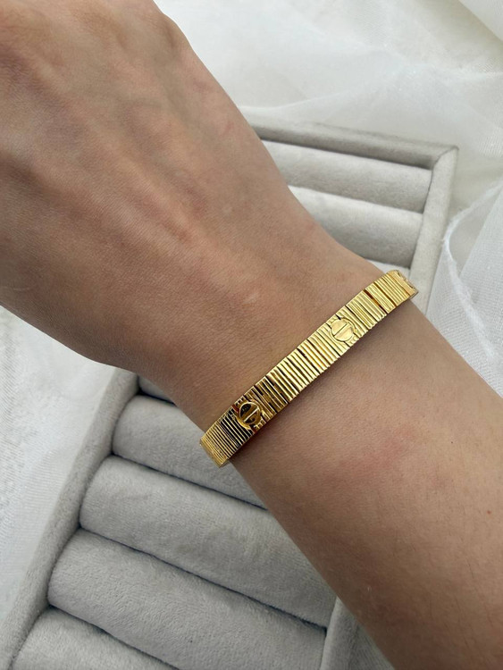 این دستبند طلایی با طراحی الهامگرفته از کالکشن نمادین Cartier، ترکیبی از سادگی لوکس و جزئیات ماندگار است. بافت خطی و پیچهای ظریف روی بدنه، حس قدرت، عشق و استایل کلاسیک را در کنار هم به نمایش میگذارد. آبکاری درجهیک و رنگ ثابت، این مدل را به انتخابی مطمئن برای استفاده روزانه و استایلهای مجلسی تبدیل کرده است.