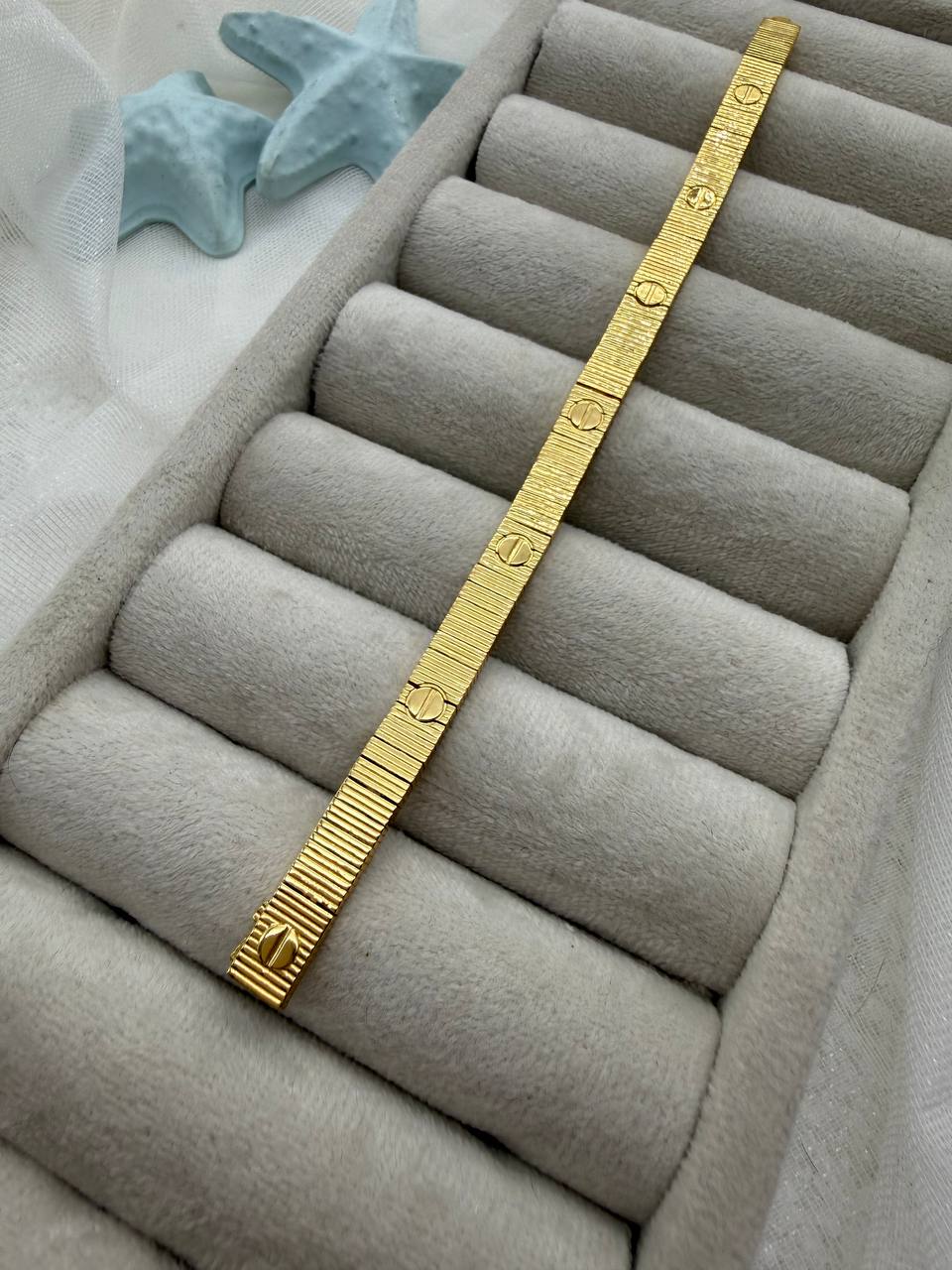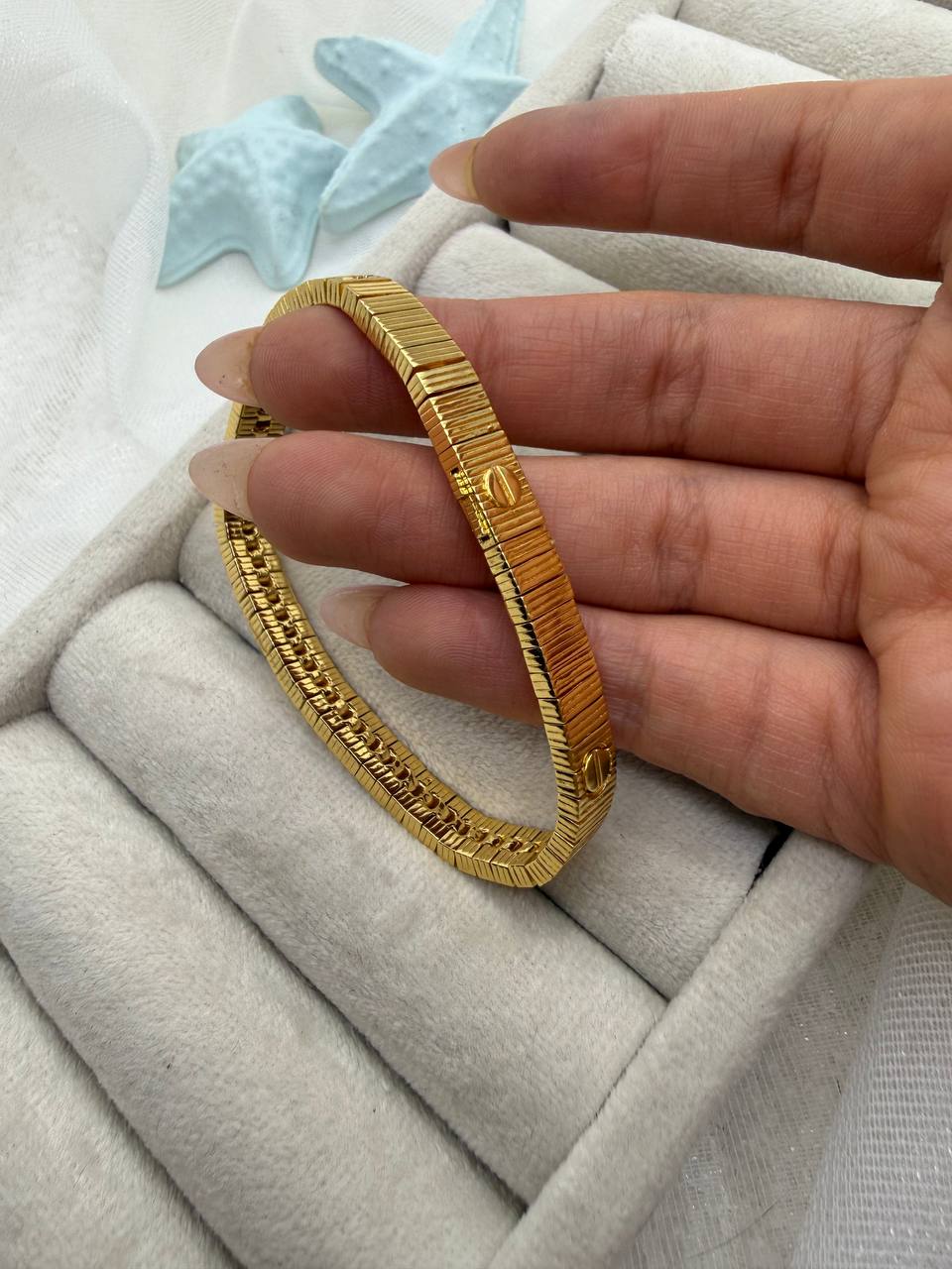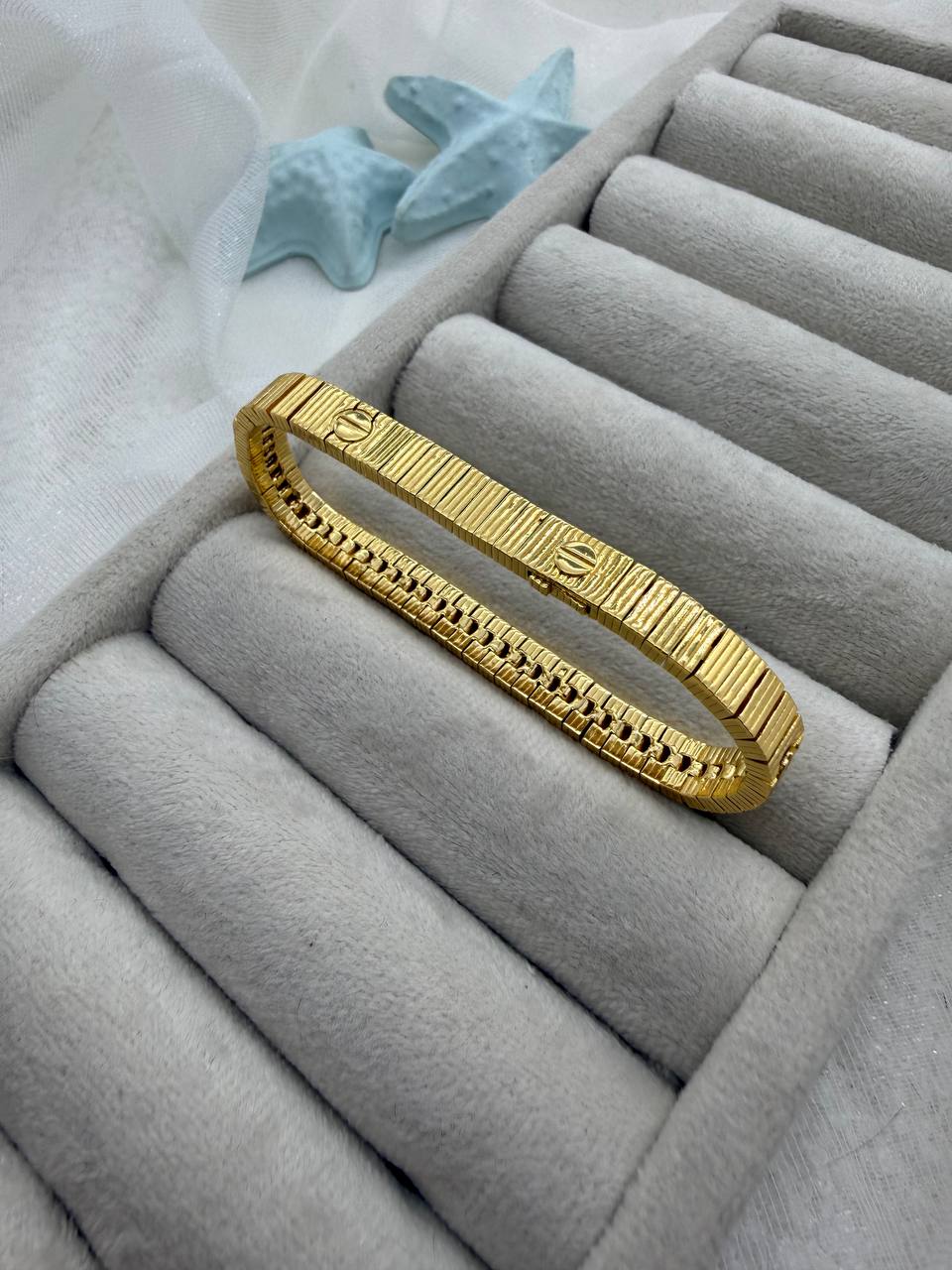 این دستبند طلایی با طراحی الهامگرفته از کالکشن نمادین Cartier، ترکیبی از سادگی لوکس و جزئیات ماندگار است. بافت خطی و پیچهای ظریف روی بدنه، حس قدرت، عشق و استایل کلاسیک را در کنار هم به نمایش میگذارد. آبکاری درجهیک و رنگ ثابت، این مدل را به انتخابی مطمئن برای استفاده روزانه و استایلهای مجلسی تبدیل کرده است.