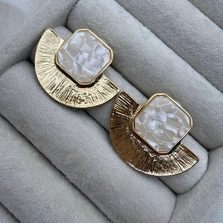این گوشوارههای خاص با ترکیب نیمدایرهی طلایی بافتدار و قطعهی مربعی رزین صدفی، جلوهای مدرن، هنری و کاملاً چشمگیر ایجاد میکنند. بافت طلایی، حس لوکس و گرم به استایل میدهد و رزین صدفی با درخشش موزاییکی، نور را به زیبایی منعکس میکند. قفل میخی باعث میشود این مدل سبک، راحت و مناسب استفاده روزانه باشد.