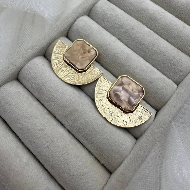 گوشواره نیمدایره طلایی و رزین صدفی و شامپاینی مربع – ترکیب هندسیِ لوکس و لطافت صدفی