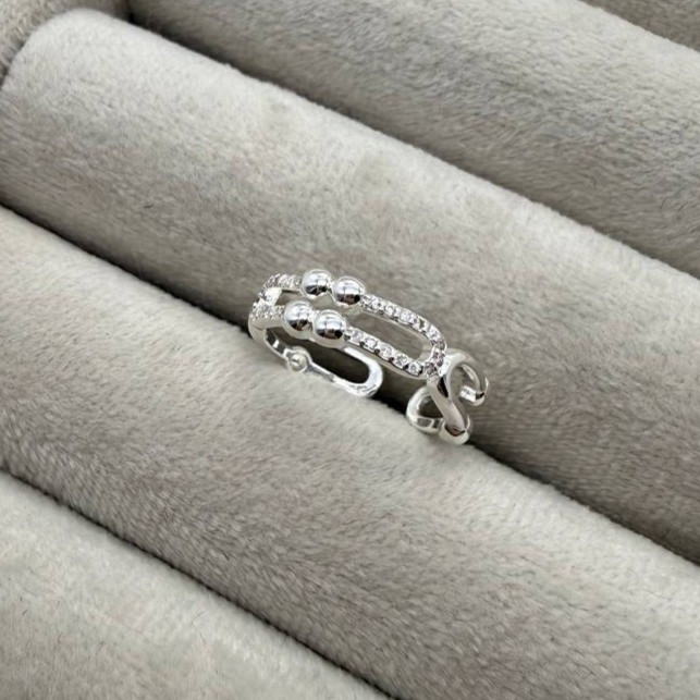 این انگشتر نقرهای با دو ردیف موازی و اتصالهای مهرهای کوچک، یک طراحی مدرن و چشمگیر ارائه میدهد. ریزنگینهای کارشده روی هر دو ردیف، جلوهای درخشان و لوکس ایجاد میکنند که در نور به زیبایی میدرخشد. فرم دوبل حلقه باعث شده این مدل هم ظریف باشد و هم متفاوت، مناسب برای کسانی که دنبال زیورآلات خاص و سبکدار هستند.