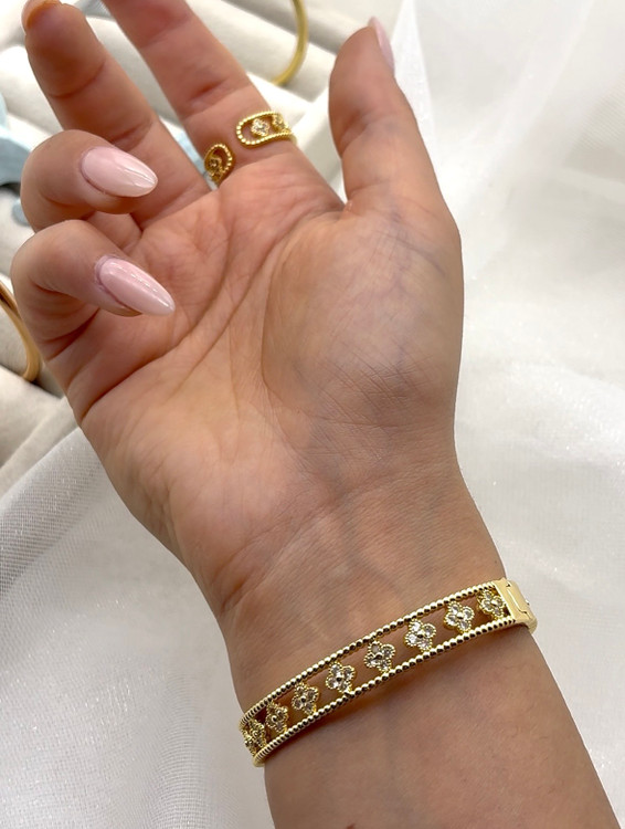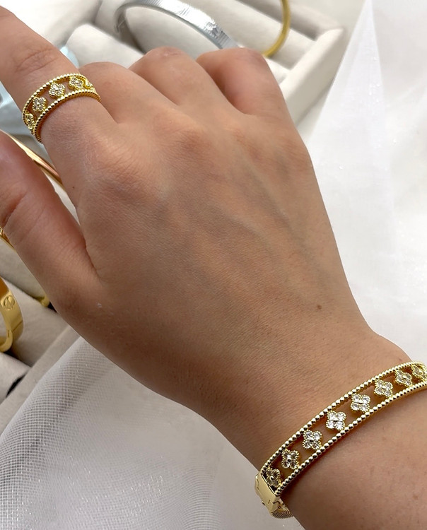 این نیمست زیبا با الهام از طرح محبوب ونکلیف، ترکیبی از ظرافت کلاسیک و درخشش نگینهای ریز و چشمگیر است. نقشهای گلمانند با نگینکاری ظریف، جلوهای زنانه، لطیف و در عین حال لوکس ایجاد میکنند. هماهنگی بنگل و انگشتر، این ست را به انتخابی ایدهآل برای استایلهای رسمی، مهمانی و حتی استفاده روزمره تبدیل کرده است.