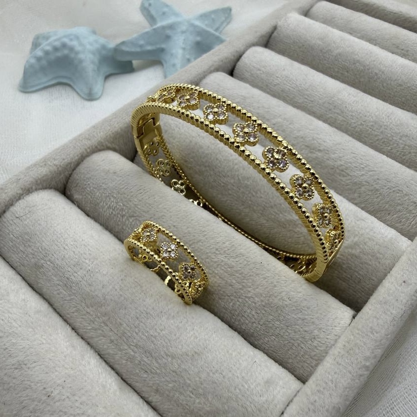 این نیمست زیبا با الهام از طرح محبوب ونکلیف، ترکیبی از ظرافت کلاسیک و درخشش نگینهای ریز و چشمگیر است. نقشهای گلمانند با نگینکاری ظریف، جلوهای زنانه، لطیف و در عین حال لوکس ایجاد میکنند. هماهنگی بنگل و انگشتر، این ست را به انتخابی ایدهآل برای استایلهای رسمی، مهمانی و حتی استفاده روزمره تبدیل کرده است.