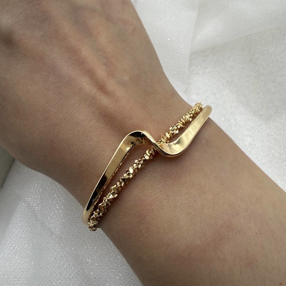 این بنگلهای موجی و خاویاری با طراحی منحنی و نگینکاری ظریف، جلوهای لوکس، مدرن و کاملاً چشمگیر ایجاد میکنند. ترکیب دو رنگ طلایی و نقرهای باعث میشود بتوانی آنها را با هر استایلی ست کنی؛ از روزمره گرفته تا مهمانیهای رسمی. طراحی موجی، حس لطافت و حرکت را منتقل میکند و نگینهای ریز، درخشش جذابی به دستها میدهند.