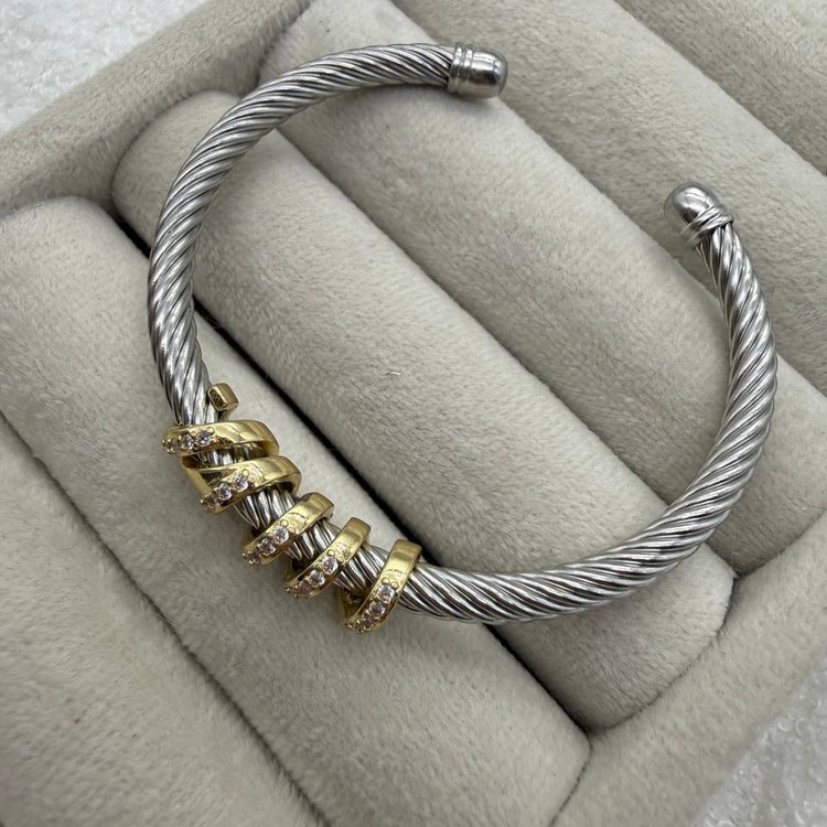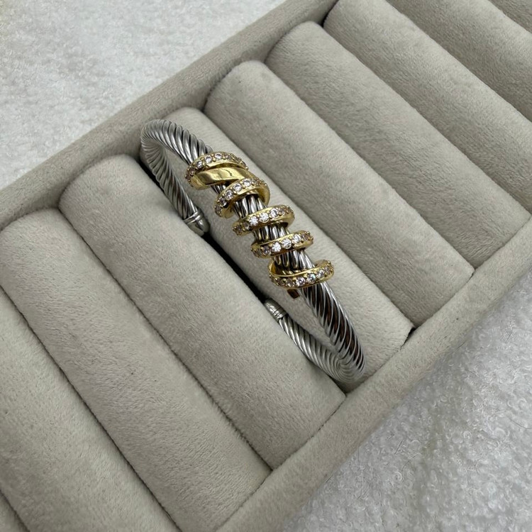 این بنگل دیوید یورمن با طراحی کابل پیچخوردهی نمادین و حلقههای طلایی نگیندار، جلوهای لوکس، مدرن و کاملاً چشمگیر ایجاد میکند. ترکیب نقرهای براق با جزئیات طلایی، استایل را خاصتر و قابل ست با هر نوع زیورآلاتی میکند. این مدل یکی از محبوبترین طرحها برای استایلهای رسمی، روزمرهی شیک و عکسهای فشن است.