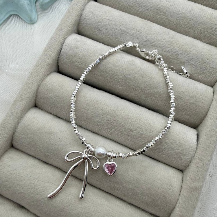 دستبند آویزدار پاپیون، قلب و مروارید – ظرافت دخترانه با درخشش نقرهای
